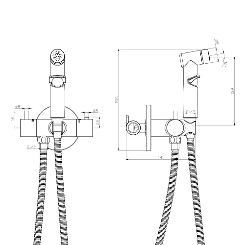 - Аксессуары в комплекте (шланг 1,2 м, лейка гигиенического душа с нажимным механизмом)