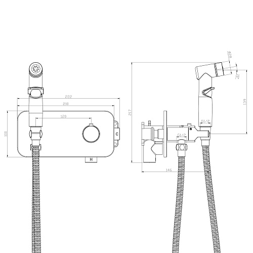 - Аксессуары в комплекте (шланг 1,2 м, лейка гигиенического душа с нажимным механизмом)