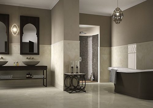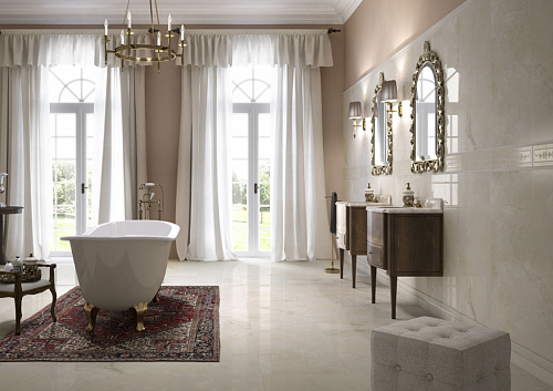 Керамогранит для ванной комнаты, кухни, прихожей, коридора, общественных помещений. Глянцевая поверхность, формат плитки 49х98 см, текстура под мрамор (оникс).