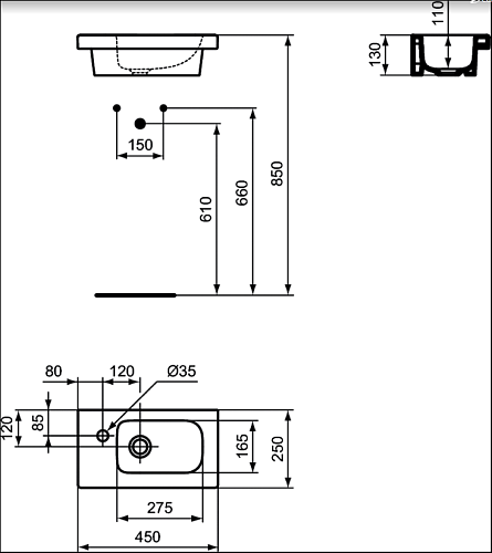 Раковина Ideal Standard E136201 Connect Space накладная 45х25 см, гостевая, левая версия, Euro White (евробелый)