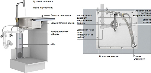 Оснащение Мойка, смеситель, система слива, корзинчатый вентиль, корпус для шланга, комплект креплений