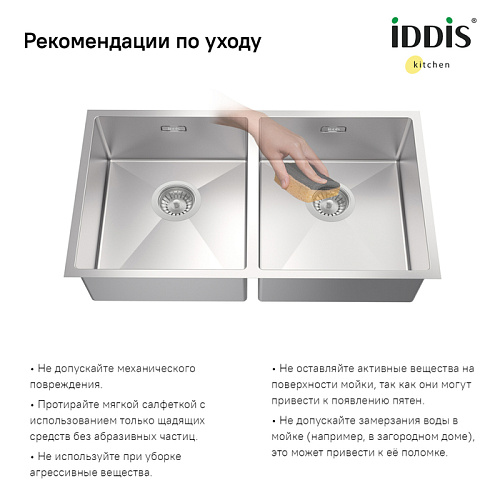 Широкая прямоугольная мойка Edifice в стильном сатиновом оттенке из линейки Kitchen Line от IDDIS® перевернет представление о привычных кухонных мойках благодаря современному дизайну и эргономичности, достойных кухни профессионального шеф-повара. Изделие состоит из двух равных, полноценных чаш (размер чаш: 340х400), каждую из которых можно использовать как отдельную рабочую поверхность. Мойка Edifice подойдет к большинству современных кухонных гарнитуров и тумб от 80 см. Несомненное преимущество серии — универсальный монтаж благодаря 2 наборам крепежа входящим в комплект. • Особая ручная технология производства позволяет добиться идеальной геометрии: малый радиус закругления углов увеличивает и без того вместительное рабочее пространство. • Высококачественная нержавеющая сталь толщиной 1,2 мм обеспечивает надежность, ударопрочность мойки и ее стойкость к износу. • Специальное антишумовое покрытие Silenon и полимерные накладки на оборотной стороне чаши снижают шум при использовании мойки. • Гарантия на мойку – 15 лет, на выпуск (входит в комплект) – 1 год. Ручное производство сохраняет толщину стального листа. Уменьшенный радиус закругления углов позволяет увеличить объём чаши и рабочую площадь дна. Антишумовое покрытие Silenon снижает уровень шума