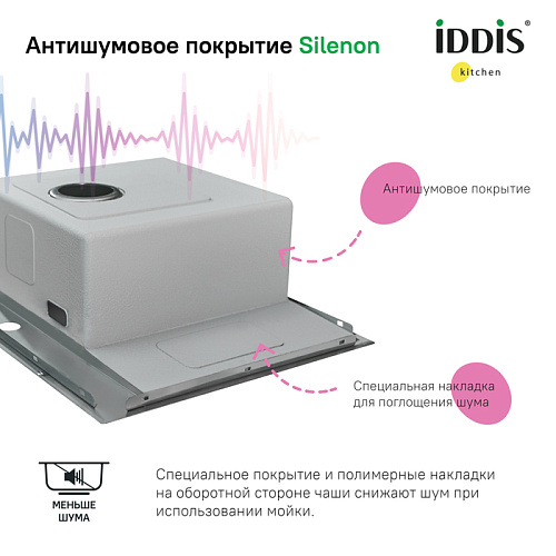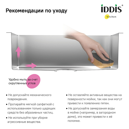 Мойки Haze отличаются современным дизайном и особой ручной технологией производства, что позволяет добиться идеальной геометрии – малый радиус закругления углов увеличивает рабочее пространство и помогает избежать «мертвых зон». Выполнение повседневных задач становится еще проще: в мойке удобно разместить большое количество посуды и мыть крупные предметы, такие как противень. Плоский сифон занимает меньше места, освобождая полезное пространство для хозяйственных мелочей. Подходит для кухонных тумб от 45 см. • Мойки IDDIS® изготовлены из качественной нержавеющей стали, которая не боится ни бытовой химии, ни царапин. Ручная обработка моек Haze позволяет сохранить изначальную толщину листа стали (1 мм) на всех элементах мойки, что обеспечивают ее надежность, ударопрочность и износостойкость. • Специальное покрытие Silenon и резиновые накладки на оборотной стороне чаши снижают шум при использовании мойки. • Гарантия на мойки IDDIS® – 15 лет. Ручное производство сохраняет толщину стального листа. Уменьшенный радиус закругления углов позволяет увеличить объём чаши и рабочую площадь дна. Антишумовое покрытие Silenon снижает уровень шума