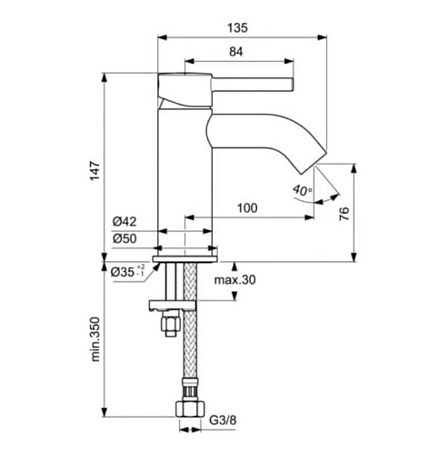 CERALINE Однорычажный смеситель для раковины, картридж 35 мм с функцией HWTC (ограничение максимальной температуры горячей воды), гибкая подводка G3/8", система монтажа EASY-FIX (облегченный монтаж), аэратор Cashe с ограничением потока 5 л/мин. металлическая рукоятка с индикаторами горячей/холодной воды, без донного клапана.