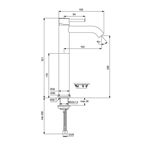 CERALINE Vessel Однорычажный смеситель для раковины с удлиненным корпусом, картридж 35 мм Firmaflow® с функцией HWTC (ограничение максимальной температуры горячей воды), гибкая подводка G3/8", монтаж IS-Fix - крепеж на центральной гайке M 33x1,5 с двумя блокирующими винтами (обеспечивает стабильную фиксацию смесителя), аэратор Cashe с ограничением потока 5 л/мин. металлическая рукоятка с индикаторами горячей/холодной воды, без донного клапана.
