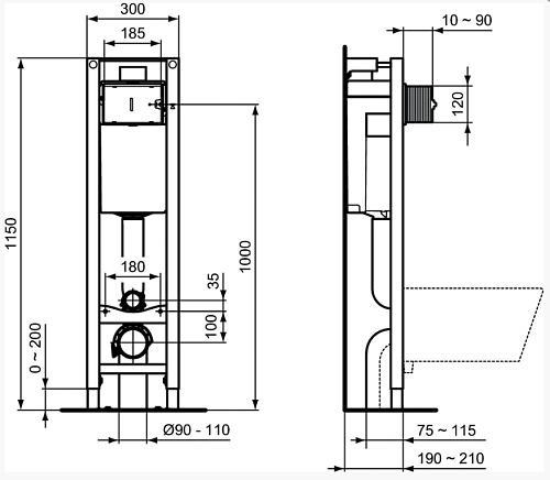 Для монтажа перед капитальной стеной или между двумя гипсокартонными стенами. Ширина рамы всего 30 см - подходит для узких стен. Рама тестирована нагрузкой 400 кг; устойчива к коррозии и царапинам. Легкая и быстрая установка при помощи системы EasyFix system. Регулируемая высота от 0 до 200 мм, регулировка высоты ножек. Встраиваемый бачок с фронтальным механическим управлением. Двойной смыв, пред-установка 6/3 л (регулировка до 4/2 л). Полипропиленовый бачок, устойчивый к термальным перепадам; прокладка против конденсата в комплекте. Маркировка наливного клапана CE EN 14055 CL1; тихий клапан, соответствующий стандарту NF, категория Class I; толщина бачка 187 мм; 1 точка подключения воды (вверху по центру). Аксессуары в комплекте: крепеж для унитаза, крепежи для рамы, подсоединения входящей и сливной труб, сливная труба и адаптор ?90/110, резиновая прокладка для унитаза ?45 мм, защитная коробка, запорный клапан G ?“.