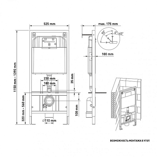 Полный комплект для установки. Толщина бачка 80 мм. Межосевое расстояние под крепежные шпильки унитаза 18 и 23 см. Резервуар воды объемом 10 литров с тепло-шумоизоляцией. Уровень шума при давлении 3 бар не превышает 13 дБ. Подвод воды сверху (G1/2 наружная). Объем смыва 3/6 литра с возможностью регулировки. Управление механическое, две кнопки. Металлический каркас, окрашенный антикоррозийной эмалью, расчетная нагрузка до 400 кг. Ножки регулировки высоты из оцинкованной стали. Возможность установки в угол.