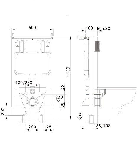 • Инсталляции для унитазов Aquatek INS-0000020 произведена в России и очень надежна в эксплуатации. Монтажная рама совместима практически с любыми моделями унитазов благодаря стандартному межосевому расстоянию под крепежные шпильки для санкерамики -18 или 23 см. Рама крепится в капитальную стену и пол. • Отличительной особенностью инсталляции Aquatek INS-0000020 является ее компактный размер, позволяющий экономить пространство. Монтажная высота рамы составляет 113 см, а минимальная глубина — всего 10 см. Расстояние между опорными ножками составляет 20 см, что дает больше возможностей для подвода канализационных труб и позволяет устанавливать раму в угол. • Конструкция надежна, выдерживает вес до 400 кг. Цельнометаллическая сварная рама изготовлена из Стального профиля толщиной 2 мм с антикоррозийным покрытием. Цельновыдувной бесшовный смывной бачок исключает вероятность протечек, защищен от конденсата изоляцией из пенополистирола. • Уплотнительные кольца и мембраны смывного механизма выполнены из силикона, менее подвержены деформации и имеют увеличенный срок службы. Сливная арматура рассчитана на 200 000 циклов использования. Сервисное обслуживание смывного бачка осуществляется через ревизионное окошко, расположенное за клавишей смыва. Регулируемый двойной слив позволяет экономить воду (3/6 л и 4,5/6 л). • Оцинкованные опорные стойки с регулировкой по высоте позволяют устанавливать инсталляцию на неровный пол.