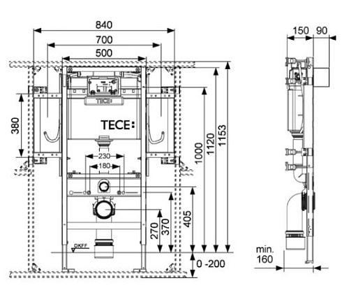 Модуль унитаза для монтажа на профиле TECEprofil, застенного монтажа на профилях или перед несущей стеной. Для безбарьерной конструкции с приподнятым монтажом унитаза. Модуль с боковыми Стальными рамками и каналами для прокладки кабелей, включая крепежные элементы. Поручень безопасности = 760 мм Комплектация частично собранного блока: Сливной бачок Uni с фронтальным приводом: • Предохранительный бак из ударопрочного Пластика • Готовый к монтажу герметизированный сливной бачок • Соединение для сливного бачка с наружной резьбой 1/2" • Объем бачка 10 литров; предустановленный стандартный смыв 6 литров; возможность настройки объема смыва 4.5/7.5/9 литров; малый слив 3 литра в системе двойного смыва. Оставшийся объем можно использовать для быстрого смыва. • Изоляция для предотвращения образования конденсата • Для панелей и рукояток смыва унитаза TECE • Возможность установки системы с одинарным или двойным смывом в зависимости от используемой панели смыва • Сертификация согласно DIN EN 14055 • Акустическая группа 1 в соответствии с DIN 4109 • Бесшумный гидравлический заливной клапан Комплект поставки модуля: • Несущая монтажная рама с порошковым покрытием • Две регулируемые опоры для напольного крепления 0-200 мм • Две крепежные шпильки M12 с гайками • Восемь модульных креплений с регулировкой глубины • Четыре мульти-зажима для крепления в каркас TECEprofil • Боковые Стальные рамки для крепления комплектов Стальных пластин • Фановый отвод унитаза DN 90, включая переходник DN 90/100 из PP • Переходник также подходит для горизонтального монтажа • Соединительный комплект унитаза DN 90, включая защитные заглушки Дополнительно приобретается: • Комплект Стальных пластин для фиксации поручней (90420xx) • Электронные компоненты активации смыва (например, дистанционная активация смыва унитаза TECEplanus) • Панель смыва унитаза (см. панели смыва) Примечание: Если используется унитаз с уменьшенной опорной поверхностью (расстояние от середины крепежного болта до нижней кромки опорной поверхности не превышает 18 см), например, V & B Memento, Sentique, Subway 2.0, необходимо установить комплект Стальных кронштейнов 9041029 в нижней части конструкции. Внимание! Соответствующий комплект Стальных/деревянных пластин для крепления поручня безопасности необходимо заказывать отдельно! В зависимости от производителя, не для всех поручней есть возможность использовать скрытую проводку кабелей.