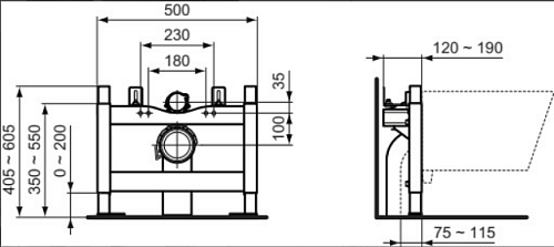 PROSYS Встраиваемая рама для монтажа подвесных унитазов. Для случаев когда бачок встроен в стену и требуется только замена напольного унитаза на подвесной. Для монтажа перед капитальной стеной или между двумя гипсокартонными стенами. Рама тестирована нагрузкой 400 кг; устойчива к коррозии и царапинам. Сливной патрубок регулируется по глубине. Регулируемая высота от 0 до 200 мм. Минимальная толщина 120 мм.