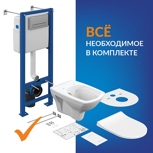 Оснащение подвесной унитаз, крышка-сиденье, инсталляция, кнопка смыва, шумоизоляционная прокладка, монтажный комплект, гарантийный талон/инструкция