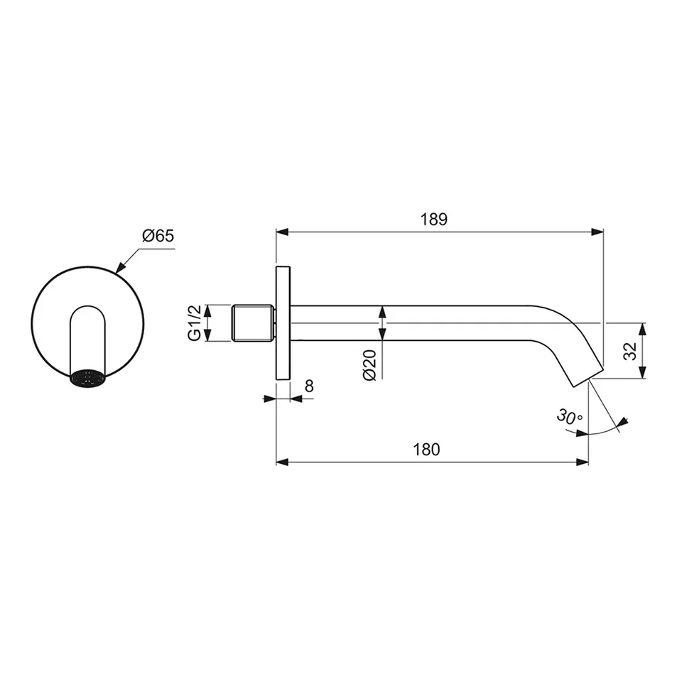 Настенный излив для ванны 180 мм, подключение 1/2", металлическая розетка ?65 мм