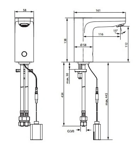 CERAPLUS Излив для раковины без смешивания, работа от блока питания, система монтажа EASY-FIX (облегченный монтаж), литой излив; крышка сенсора в комплекте (для использования во время чистки корпуса), длина излива 116 мм, ламинарный регулятор потока (защита от попадания бактерий) с ограничением потока 5 л/мин. электромагнитный клапан интегрирован в корпус, полнофункциональный электронный датчик (регулируемые функции), блок питания с адаптером на (AC 220V), кабель 2 м, гибкая подводка G3/8", шланги стандартной длины 400 мм. Изделие может использоваться только в системах высокого давления (мин. 0,5 атм); рекомендована предварительная установка фильтра 50 мм (для обеспечения надлежащей работы электромагнитного клапана).