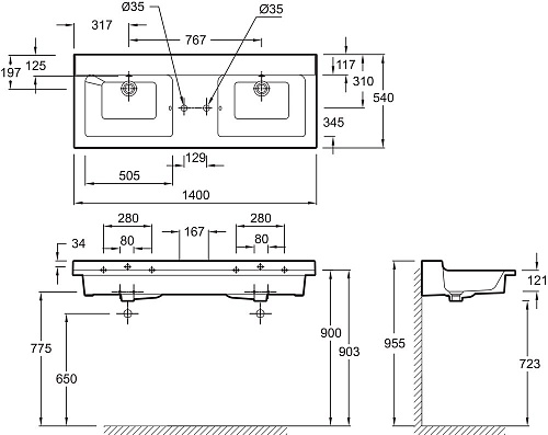 • Двойная подвесная раковина-столешница 140 см