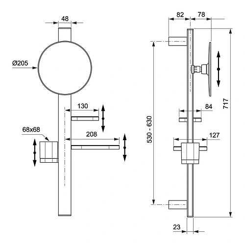 ALU+ Beauty Bar S Комплект аксессуаров, состоящий из: штанги 700 мм с направляющими справа и слева для установки аксессуаров по выбору при первичном монтаже; увеличительного зеркала 200 мм, крепление на шаровом шарнире для регулировки угла; большой полочки 208 мм (макс. нагрузка 7кг); стаканчика; маленькой полочки 130 мм (макс. нагрузка 7кг)
