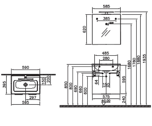 Комплект мебели Vitra 75023 Mia: тумба 60 см, раковина, зеркало c подсветкой, белый глянцевый