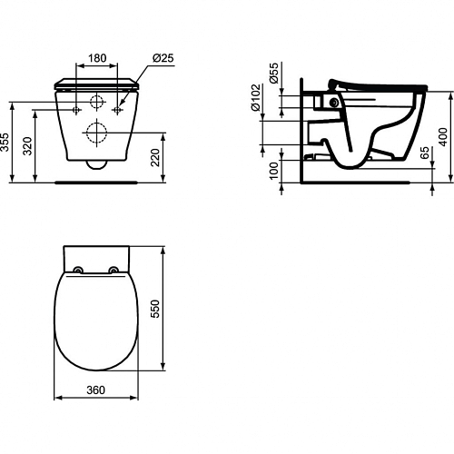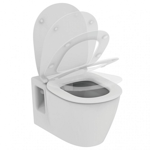 Промо-комплект, состоящий из: E822301 CONNECT Rimless Безободковый подвесной унитаз, глубокий смыв, с сидением и крышкой с функцией плавного закрытия E772401, без крепежа; R020467 PROSYS FRAME 120 M Встраиваемая инсталляция для монтажа для монтажа подвесных унитазов.