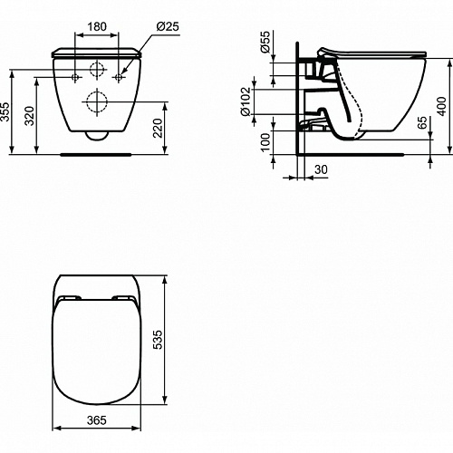 Оснащение Инсталляция R027767, унитаз T007901, крышка-сиденье T352701, клавиша смыва R0116AA, крепления для полностью скрытого монтажа TT0299598.