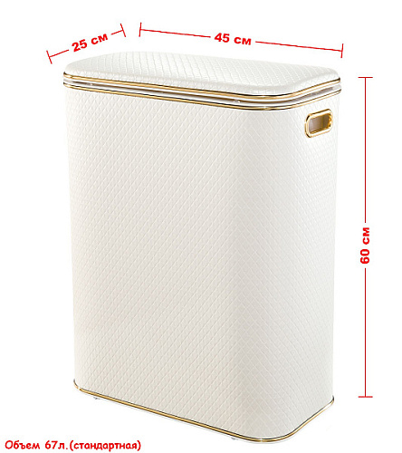 Можно использовать как пуфик или стульчик. Выдерживает вес до 100 кг. Плавное закрывание крышки. Внутри корзин съемный мешок, который легко стирается. Дополнительная вентиляции за счет отверстий ручек и вентиляционной решетки на днище корзины. Материал Экокожа долговечен, не имеет запаха, легок в уходе Собственное производство, со строжайшим контролем качества! Гарантия производителя 2 года.