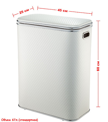 Можно использовать как пуфик или стульчик. Выдерживает вес до 100 кг. Плавное закрывание крышки. Внутри корзин съемный мешок, который легко стирается. Дополнительная вентиляции за счет отверстий ручек и вентиляционной решетки на днище корзины. Материал Экокожа долговечен, не имеет запаха, легок в уходе Собственное производство, со строжайшим контролем качества! Гарантия производителя 2 года.