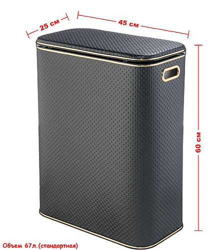 Можно использовать как пуфик или стульчик. Выдерживает вес до 100 кг. Плавное закрывание крышки. Внутри корзин съемный мешок, который легко стирается. Дополнительная вентиляции за счет отверстий ручек и вентиляционной решетки на днище корзины. Материал Экокожа долговечен, не имеет запаха, легок в уходе Собственное производство, со строжайшим контролем качества! Гарантия производителя 2 года.