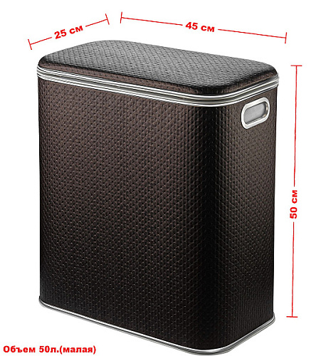 Можно использовать как пуфик или стульчик. Выдерживает вес до 100 кг. Плавное закрывание крышки. Внутри корзин съемный мешок,который легко стирается. Дополнительная вентиляции за счет отверстий ручек и вентиляционной решетки на днище корзины. Материал Экокожа долговечен, не имеет запаха, легок в уходе Собственное производство, строжайший контроль качества. Гарантия производителя 2 года.
