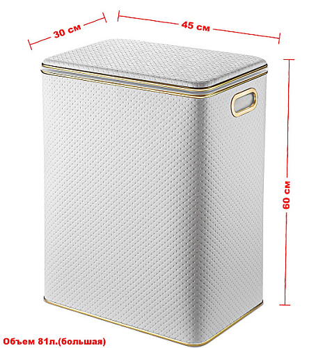 Можно использовать как пуфик или стульчик. Выдерживает вес до 100 кг. Плавное закрывание крышки. Внутри корзин съемный мешок,который легко стирается. Дополнительная вентиляции за счет отверстий ручек и вентиляционной решетки на днище корзины. Материал Экокожа долговечен, не имеет запаха, легок в уходе