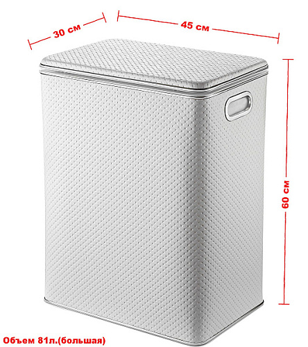 Можно использовать как пуфик или стульчик. Выдерживает вес до 100 кг. Плавное закрывание крышки. Внутри корзин съемный мешок,который легко стирается. Дополнительная вентиляции за счет отверстий ручек и вентиляционной решетки на днище корзины. Материал Экокожа долговечен, не имеет запаха, легок в уходе