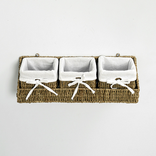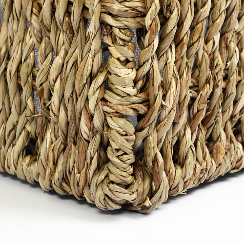 Назначение: Плетеная корзина. Материал: Морские водоросли, текстиль. Покрытие: Водоотталкивающее покрытие. Описание: Размер: 55 x 18 x 15 см* (16х16х14см*) Съемный чехол можно стирать в машинке при температуре не выше 60 градусов.