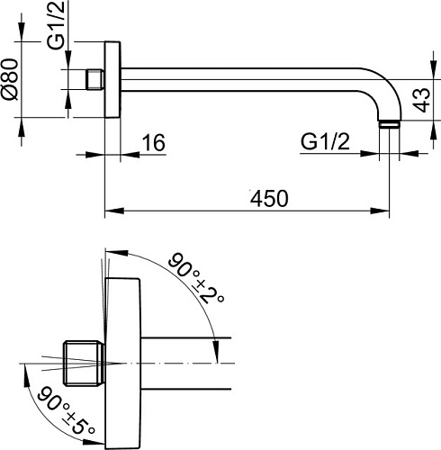 Из стены G1/2, с круглым отражателем, возможность выравнивания к стене (90° ± 2°) и к подключению в стене (90° ± 5°).