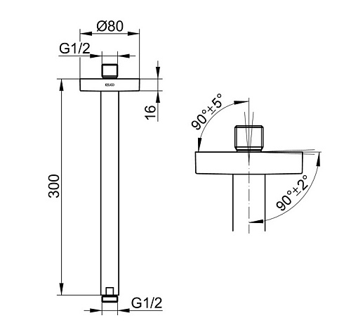 К потолку G1/2, возможность выравнивания по потолку (90° ± 2°) и к подключению в потолке (90° ± 5°).