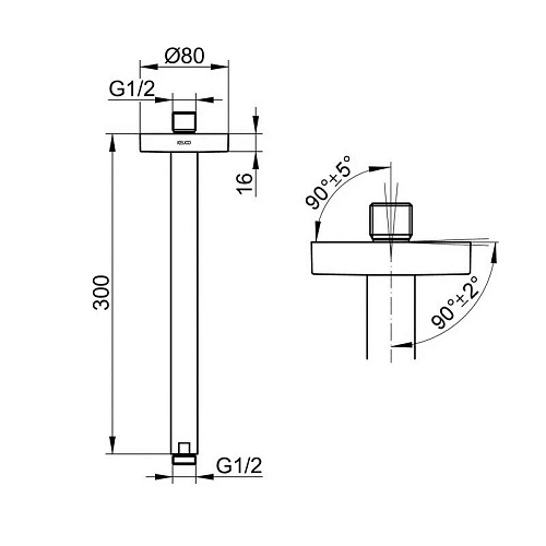 К потолку G1/2, возможность выравнивания по потолку (90° ± 2°) и к подключению в потолке (90° ± 5°).