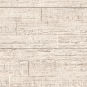 Ламинированное напольное покрытие в декоре Дуб деревенский белый имеет натуральный древесный рисунок светлого оттенка с ярко выраженными следами распила.