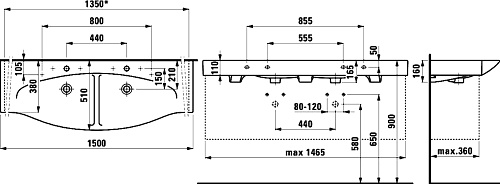 Двойная раковина-столешница Palace 150x51 см, с отв. для смесителя, цвет белый
