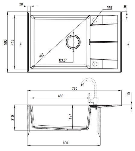 Способ монтажа: впускаемый. Минимальная ширина шкафа [мм]: 600. Глубина чаши 1 [мм]: 197. Вырез в столешнице (впускаемая) - длина [мм]: 760. Вырез в столешнице (впускаемая) - ширина [мм]: 480. Универсальный: да. Количество готовых отверстий: 2. Количество фрезерованных отверстий: 0. Отделка: сталь. Вид клапана: автоматический. Компактный сифон Space-Saver: да. Телескопический сифон: да. Возможность подключения посудомоечной/стиральной машины: да. Свойства гранита Deante: ударопрочность, выносливость на высокую температуру, обесцвечивание, термический удар. Самая продолжительная гарантия 18 лет. Мойка с сифоном для подключения к посудомоечной машине. Гидрофобные свойства отталкивают молекулы воды. Исключительно просторная и глубокая чаша вмещает даже противни, вынутые из духовки. Возможность приобрести крючок для губки, который идеально подходит к данной модели. Можно приобрести поручень для полотенца, идеально подходящий к данной модели. Реверсивная мойка - установите чашу слева или справа. Отделка, обогащенная ионами серебра, придает антисептические свойства. Компактный сифон Space-saver позволяющий ограничит место под мойкой. Специальное средство, безопасное для очищаемых поверхностей.