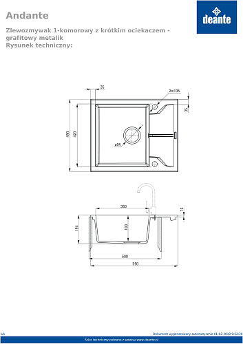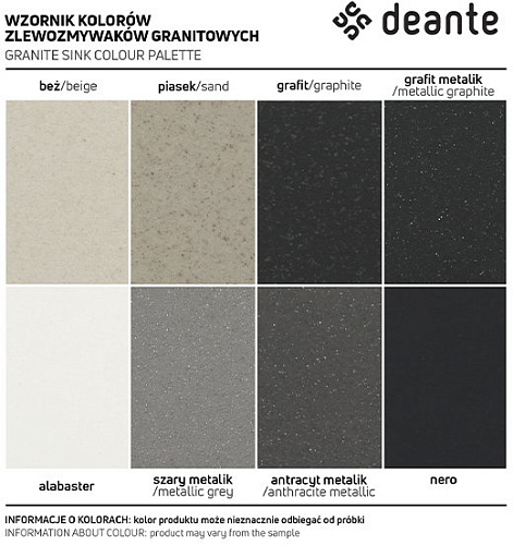 Способ монтажа: впускаемый. Минимальная ширина шкафа [мм]: 600. Глубина чаши 1 [мм]: 180. Вырез в столешнице (впускаемая) - длина [мм]: 760. Вырез в столешнице (впускаемая) - ширина [мм]: 470. Универсальный: да. Количество готовых отверстий: 2. Количество фрезерованных отверстий: 0. Отделка: сталь. Вид клапана: автоматический. Компактный сифон Space-Saver: да. Возможность подключения посудомоечной/стиральной машины: да. Свойства гранита Deante: ударопрочность, выносливость на высокую температуру, обесцвечивание, термический удар. Самая продолжительная гарантия 18 лет. Мойка с сифоном для подключения к посудомоечной машине. Аксессуары с автоматическим отключением слива. Гидрофобные свойства отталкивают молекулы воды. Исключительно просторная и глубокая чаша вмещает даже противни, вынутые из духовки. Реверсивная мойка - установите чашу слева или справа. Специальное средство, безопасное для очищаемых поверхностей. Компактный сифон Space-saver позволяющий ограничит место под мойкой.