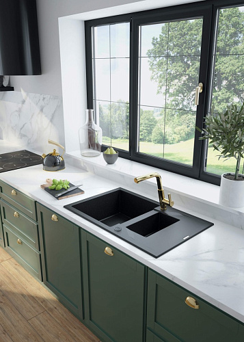 Способ монтажа: впускаемый. Минимальная ширина шкафа [мм]: 700. Глубина чаши 1 [мм]: 180. Глубина чаши 2 [мм]: 120. Вырез в столешнице (впускаемая) - длина [мм]: 760. Вырез в столешнице (впускаемая) - ширина [мм]: 470. Универсальный: да. Количество готовых отверстий: 2. Количество фрезерованных отверстий: 0. Отделка: сталь. Вид клапана: автоматический. Компактный сифон Space-Saver: да. Возможность подключения посудомоечной/стиральной машины: да. Свойства гранита Deante: ударопрочность, выносливость на высокую температуру, обесцвечивание, термический удар. Самая продолжительная гарантия 18 лет. Мойка с сифоном для подключения к посудомоечной машине. Аксессуары с автоматическим отключением слива. Гидрофобные свойства отталкивают молекулы воды. Отделка, обогащенная ионами серебра, придает антисептические свойства. Исключительно просторная и глубокая чаша вмещает даже противни, вынутые из духовки. Дополнительное многофункциональное небольшое отделение — например, для промывания овощей и фруктов или подключения кофемолки. Реверсивная мойка - установите чашу слева или справа. Специальное средство, безопасное для очищаемых поверхностей. Компактный сифон Space-saver позволяющий ограничит место под мойкой.