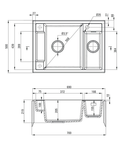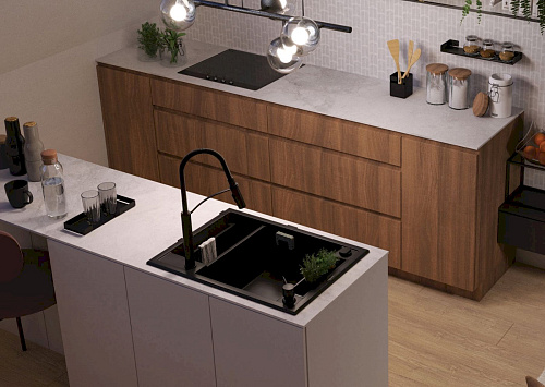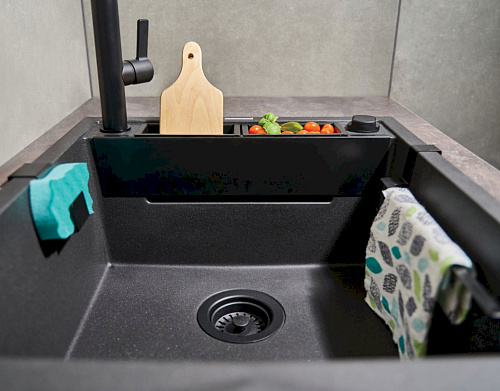 Способ монтажа: впускаемый. Минимальная ширина шкафа [мм]: 700. Глубина чаши 1 [мм]: 205. Глубина чаши 2 [мм]: 155. Вырез в столешнице (впускаемая) - длина [мм]: 670. Вырез в столешнице (впускаемая) - ширина [мм]: 480. Количество готовых отверстий: 1. Количество фрезерованных отверстий: 2. Вид клапана: автоматический, с кнопкой. Компактный сифон Space-Saver: да. Возможность подключения посудомоечной/стиральной машины: да. Свойства гранита Deante: ударопрочность, выносливость на высокую температуру, обесцвечивание, термический удар. Аксессуары с автоматическим отключением слива. Мойка с сифоном для подключения к посудомоечной машине. Гидрофобные свойства отталкивают молекулы воды. Исключительно просторная и глубокая чаша вмещает даже противни, вынутые из духовки. Дополнительное многофункциональное небольшое отделение — например, для промывания овощей и фруктов или подключения кофемолки. Дополнительные фрезерованные отверстия для монтажа, например, дозатора. Магниты, встроенные в корпус раковины. Можно приобрести аксессуары, которые идеально подойдут к этой модели. Специальное средство, безопасное для очищаемых поверхностей. Компактный сифон Space-saver позволяющий ограничит место под мойкой. Самая продолжительная гарантия 18 лет. Отделка, обогащенная ионами серебра, придает антисептические свойства. Можно приобрести поручень для полотенца, идеально подходящий к данной модели. Возможность приобрести крючок для губки, который идеально подходит к данной модели.