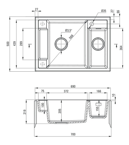 Способ монтажа: впускаемый. Минимальная ширина шкафа [мм]: 700. Глубина чаши 1 [мм]: 205. Глубина чаши 2 [мм]: 155. Вырез в столешнице (впускаемая) - длина [мм]: 670. Вырез в столешнице (впускаемая) - ширина [мм]: 480. Количество готовых отверстий: 1. Количество фрезерованных отверстий: 2. Отделка: сталь. Вид клапана: автоматический, с кнопкой. Компактный сифон Space-Saver: да. Возможность подключения посудомоечной/стиральной машины: да. Свойства гранита Deante: ударопрочность, выносливость на высокую температуру, обесцвечивание, термический удар. Мойка с сифоном для подключения к посудомоечной машине. Аксессуары с автоматическим отключением слива. Гидрофобные свойства отталкивают молекулы воды. Отделка, обогащенная ионами серебра, придает антисептические свойства. Исключительно просторная и глубокая чаша вмещает даже противни, вынутые из духовки. Дополнительное многофункциональное небольшое отделение — например, для промывания овощей и фруктов или подключения кофемолки. Дополнительные фрезерованные отверстия для монтажа, например, дозатора. Магниты, встроенные в корпус раковины. Можно приобрести аксессуары, которые идеально подойдут к этой модели. Специальное средство, безопасное для очищаемых поверхностей. Компактный сифон Space-saver позволяющий ограничит место под мойкой. Самая продолжительная гарантия 18 лет. Можно приобрести поручень для полотенца, идеально подходящий к данной модели. Возможность приобрести крючок для губки, который идеально подходит к данной модели.