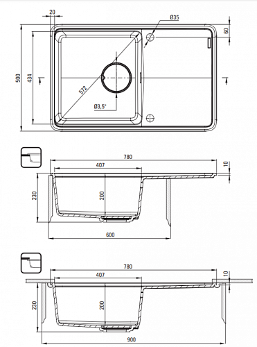 Способ монтажа: впускаемый, подвесной. Минимальная ширина шкафа [мм]: 600. Глубина чаши 1 [мм]: 200. Вырез в столешнице (впускаемая) - длина [мм]: 760. Вырез в столешнице (впускаемая) - ширина [мм]: 480. Вырез в столешнице (подвесная) - длина [мм]: 740. Вырез в столешнице (подвесная) - ширина [мм]: 460. Универсальный: да. Количество готовых отверстий: 2. Количество фрезерованных отверстий: 2. Отделка: сталь. Вид клапана: автоматический, с кнопкой. Компактный сифон Space-Saver: да. Возможность подключения посудомоечной/стиральной машины: да. Глубокая чаша. Возможен монтаж под столешницей. Декоративная заглушка к сифону. Автоматическая пробка CLICK. Свойства гранита Deante: ударопрочность, выносливость на высокую температуру, обесцвечивание, термический удар. Гидрофобные свойства отталкивают молекулы воды. Компактный сифон Space-saver позволяющий ограничит место под мойкой. Специальное средство, безопасное для очищаемых поверхностей.