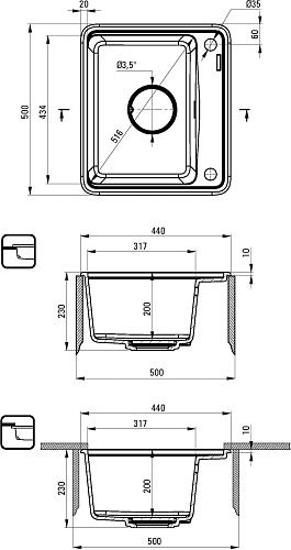 Способ монтажа: впускаемый, подвесной. Минимальная ширина шкафа [мм]: 500. Глубина чаши 1 [мм]: 200. Вырез в столешнице (впускаемая) - длина [мм]: 480. Вырез в столешнице (впускаемая) - ширина [мм]: 420. Вырез в столешнице (подвесная) - длина [мм]: 460. Вырез в столешнице (подвесная) - ширина [мм]: 400. Универсальный: да. Количество готовых отверстий: 2. Количество фрезерованных отверстий: 0. Вид клапана: автоматический, с кнопкой. Компактный сифон Space-Saver: да. Возможность подключения посудомоечной/стиральной машины: да. Глубокая чаша. Возможен монтаж под столешницей. Декоративная заглушка к сифону. Автоматическая пробка CLICK. Свойства гранита Deante: ударопрочность, выносливость на высокую температуру, обесцвечивание, термический удар. Гидрофобные свойства отталкивают молекулы воды. Компактный сифон Space-saver позволяющий ограничит место под мойкой. Специальное средство, безопасное для очищаемых поверхностей.