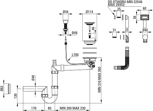 Способ монтажа: впускаемый, подвесной. Минимальная ширина шкафа [мм]: 600. Глубина чаши 1 [мм]: 200. Вырез в столешнице (впускаемая) - длина [мм]: 760. Вырез в столешнице (впускаемая) - ширина [мм]: 480. Вырез в столешнице (подвесная) - длина [мм]: 740. Вырез в столешнице (подвесная) - ширина [мм]: 460. Универсальный: да. Количество готовых отверстий: 2. Количество фрезерованных отверстий: 2. Отделка: сталь. Вид клапана: автоматический, с кнопкой. Компактный сифон Space-Saver: да. Возможность подключения посудомоечной/стиральной машины: да. Глубокая чаша. Возможен монтаж под столешницей. Декоративная заглушка к сифону. Автоматическая пробка CLICK. Свойства гранита Deante: ударопрочность, выносливость на высокую температуру, обесцвечивание, термический удар. Гидрофобные свойства отталкивают молекулы воды. Компактный сифон Space-saver позволяющий ограничит место под мойкой. Специальное средство, безопасное для очищаемых поверхностей. Отделка, обогащенная ионами серебра, придает антисептические свойства.