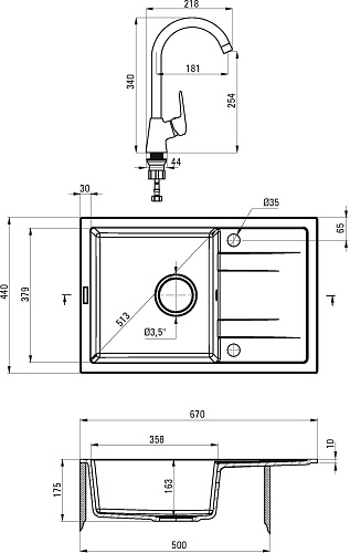 Оснащение Смеситель, сифон, аэратор, соединительные шланги 45 см.