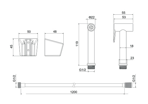 Оснащение 1. Держатель для душа 2. Шланг 120 см 3. Гигиеническая лейка