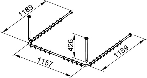 Оснащение Четыре настенных крепления, три штанги для душевой занавески 1100 мм, две штанги угловых 90° для квадратных поддонов, две опоры к потолку 400 мм, три упаковки колец для занавески, белые (количество в упаковке: 10 шт.), два соединительных элемента.