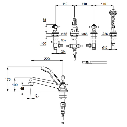 Смеситель Kludi 515254520 1926 для ванны,душа, DN 15, на 4 отверстия, позолоченный,23 кар.