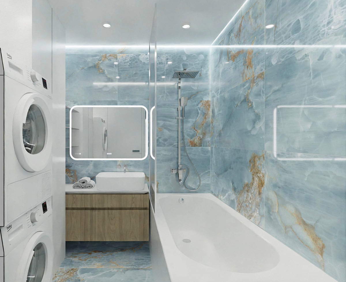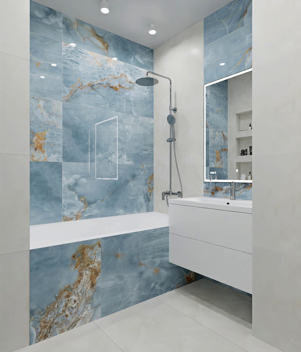 Керамогранит под оникс (Onyx Aqua Blue Gold), размер 60*120. Поверхность полированная. Применяется  для ванной, кухни, прихожей, гостиной, технических и общественных помещений. Может использоваться для наружных работ. Универсален, подходит для стилей: Неоклассический, Современный,  Классический.