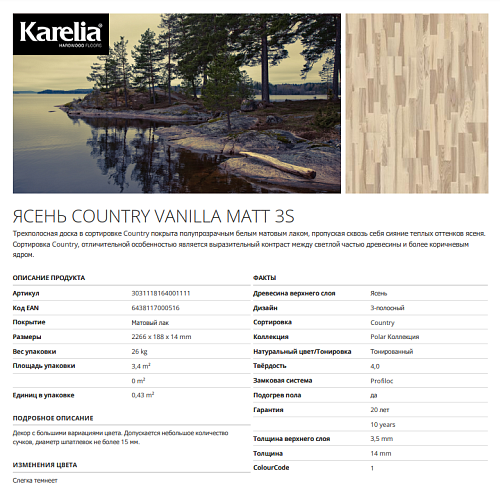 Паркетная доска Karelia ASH COUNTRY VANILLA MATT 3S, 14мм