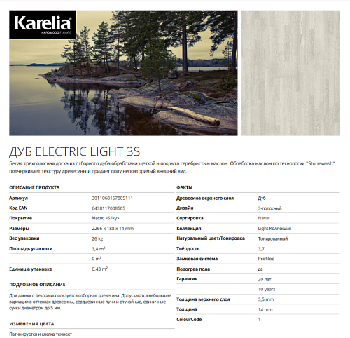Паркетная доска Karelia OAK ELECTRIC LIGHT 3S, 14 мм
