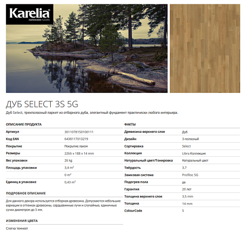 Покрытие лаком - покрытие глянцевым лаком служит деревянному полу надежной и продолжительной защитой. Полуматовый лак дополняет характер древесины, подчеркивая её натуральность. Матовый лак создает впечатление необработанного деревянного покрытия. Гладкая поверхность - естественная гладкая поверхность дерева. Select - для сортировки Select используется древесина с наиболее ровными текстурой и цветом. Древесина этой сортировки спокойная с ограниченными вариациями по оттенкам. Сучки практически совсем отсутствуют. Profiloc 5G - замковая система Profiloc 5G плотно фиксирует доски пола без необходимости использования клея или специальных инструментов, гарантирует прочность пола и облегчает его укладку. Эта система позволяет укладывать паркетную доску на бОльшие площади (до 15 м в ширину и 25 м в длину) без использования компенсационных швов. В результате – качественный и долговечный пол, противостоящий интенсивной эксплуатации и сезонным изменениям.